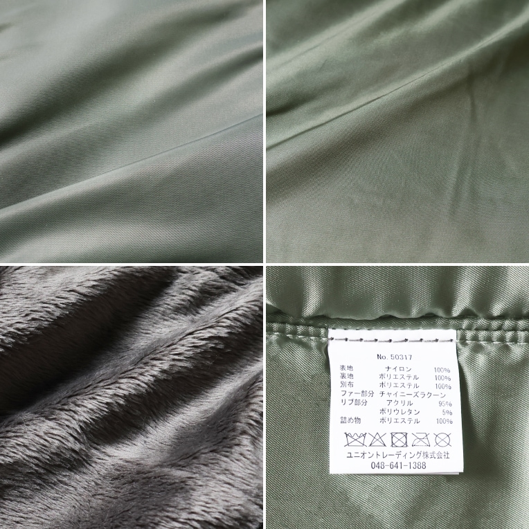 | 素材 | 表地 ナイロン100% / 裏地 ポリエステル100% / 別布 ポリエステル100% / ファー部分 チャイニーズラクーン / リブ部分 アクリル95% ポリウレタン5% / 詰め物 ポリエステル100% |