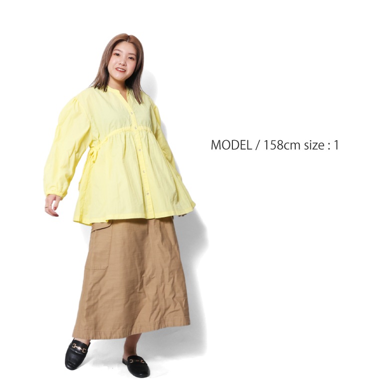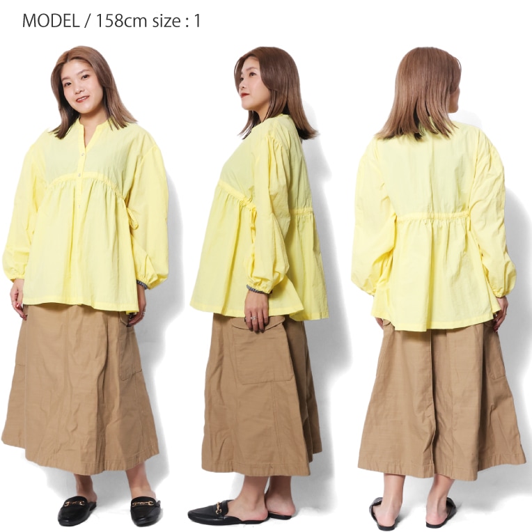 | 商品説明 | たっぷりとギャザーが入った女性らしいシルエットのブラウス。首元はすっきりとしたスキッパーデザイン。お手入れしやすく軽い生地感のワッシャーナイロンを使用。袖をまくってバルーンスリーブにしたり、サイドの紐を絞ってシルエットを変化させたり、一着で様々なスタイリングを楽しめます。 |