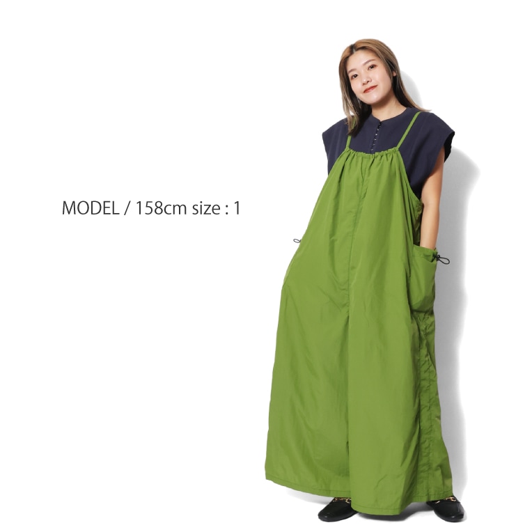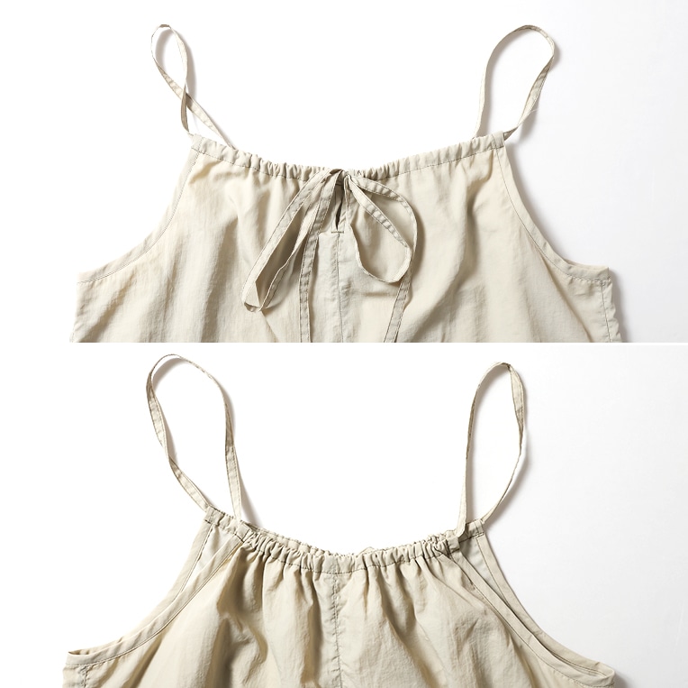 | 商品説明 | 前後どちらを前にしても着られるキャミソールサロペット。お手入れしやすく軽い生地感のワッシャーナイロンを使用。普段着はもちろん、レジャーなどにも活躍します。サイドのさりげないラインや大きなポケットがシンプルなアイテムにスポーティな雰囲気をプラスしています。 |