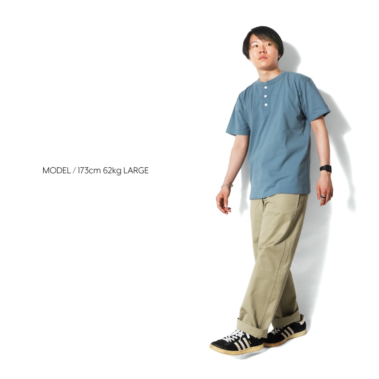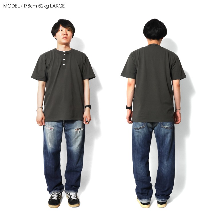 | 商品説明 | USライクなオープンエンド糸を使用し、6.2オンスのヘビーウエイトで編み立てたボディにピグメント加工を施したヘンリーネックTシャツ。生地だけでなく、バインダーネックやネコ目ボタン、天地縫い裾始末など、ビンテージTシャツのディテールがふんだんに取り入れられてる。 |