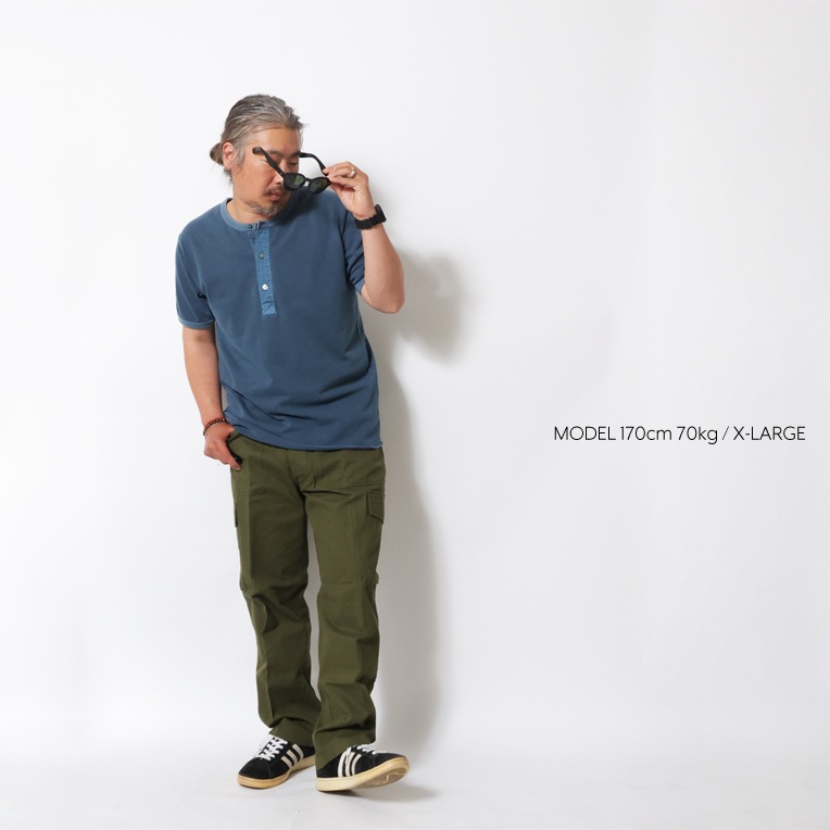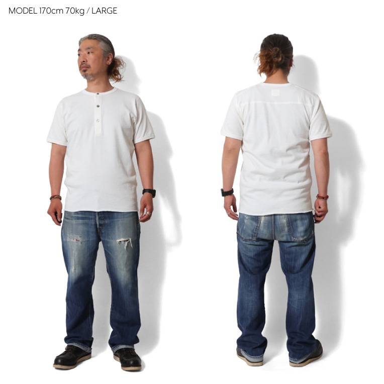 | 商品説明 | 適度な厚みのメッシュ素材を採用した快適なヘンリーネック半袖Tシャツ。製品ピグメント加工を行い、レトロ感が演出され一枚での着用や重ね着、インナーとしても着用できるので季節を問わず着用可能な一着。 |