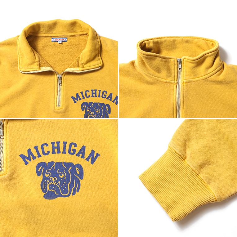 HOUSTON woman / ヒューストン ウーマン 2031W PIGMENT PRINT HALF ZIP SWEAT (MICHIGAN) / ピグメントプリントハーフジップスウェット -全3色- レディース トレーナー 犬 ブルドッグ カレッジ風 加工 ミリタリー アメカジ ヴィンテージ [2031W]