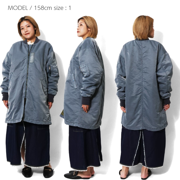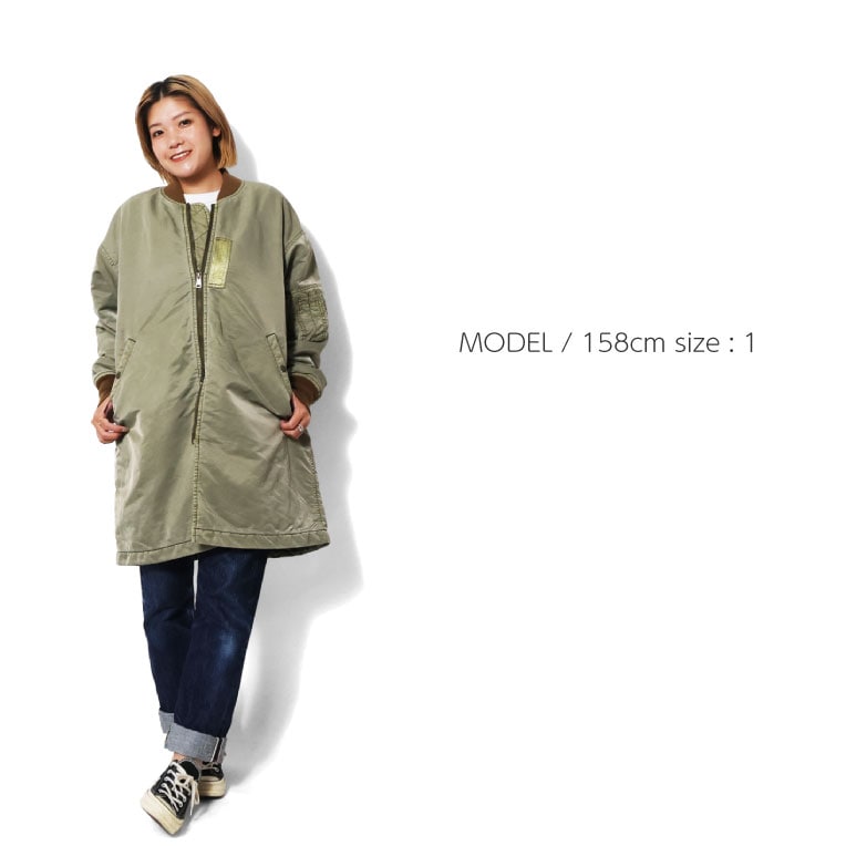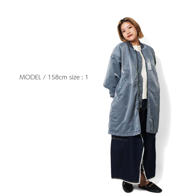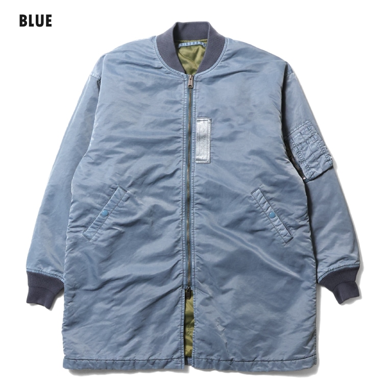 | 商品説明 | 後染め加工を施した初期型MA-1をベースにデザインしたロングコート。顔料染めならではのムラ感のある染まり方が独特の色目、光沢感を作りだし奥行のある見栄えが特徴で、雰囲気抜群の仕上がりとなっています。裏面にひょうたんキルトを採用。軽い着心地でストレスフリーな一枚です。 |