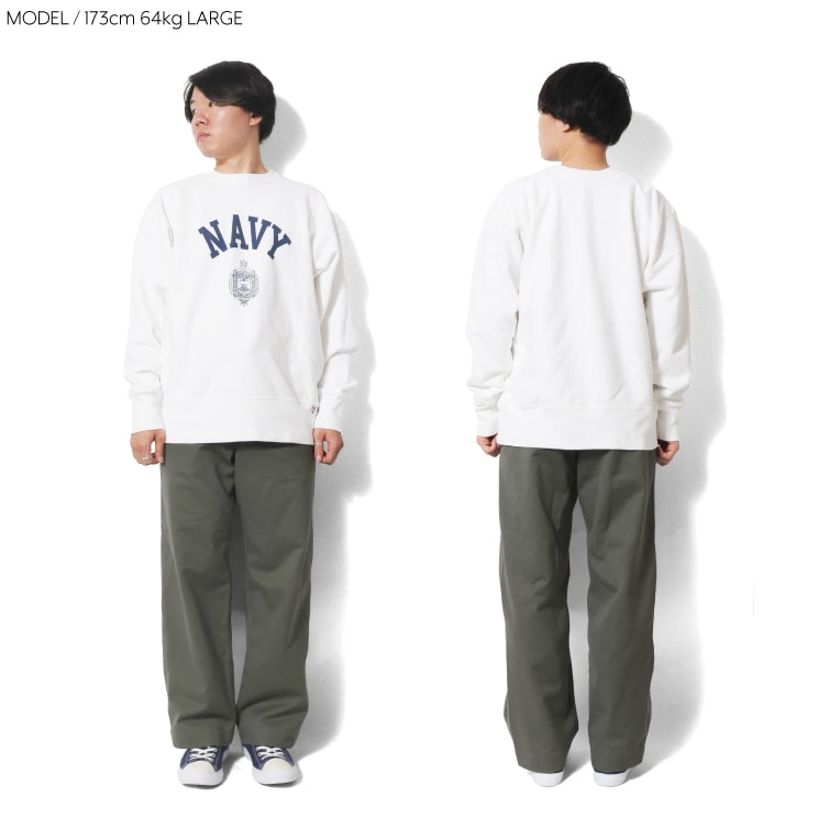 | 商品説明 | 脇にリブ切り替えの入った、裏起毛のリバースタイプのスウェット。贅沢にU.S.コットンを使用して編み立てています。ミリタリーリバースの名品、U.S.NAVYのロゴを、インクの浸透率を上げた、超染み込みプリントで再現しています。こちらの商品は公式ライセンス商品です。海外での販売及び発送は対応しておりません。日本国内での販売限定になります。スウエット スエット |