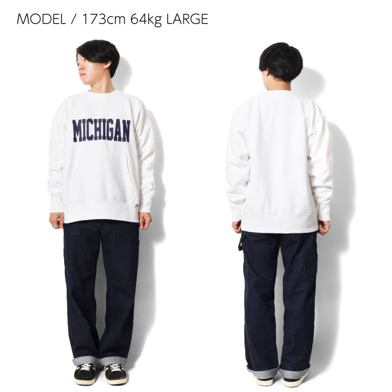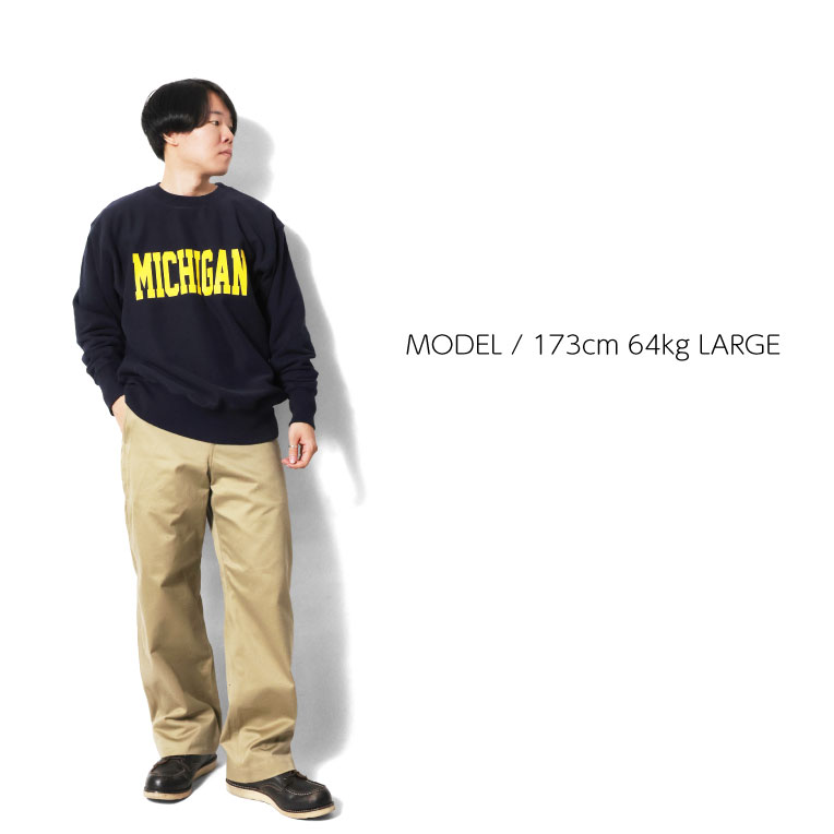 | 商品説明 | 脇にリブ切り替えの入った、裏起毛のリバースタイプのスウェット。贅沢にU.Sコットンを使用して編み立てています。再現性の難しい特徴的な杢感グレーは糸から選定し、できるだけ忠実にリプロダクト。リバーススウェットのカレッジの定番、ミシガン大学のロゴをラバープリントで再現。このモチーフにピッタリなネイビーも新色で追加。 |