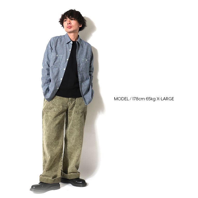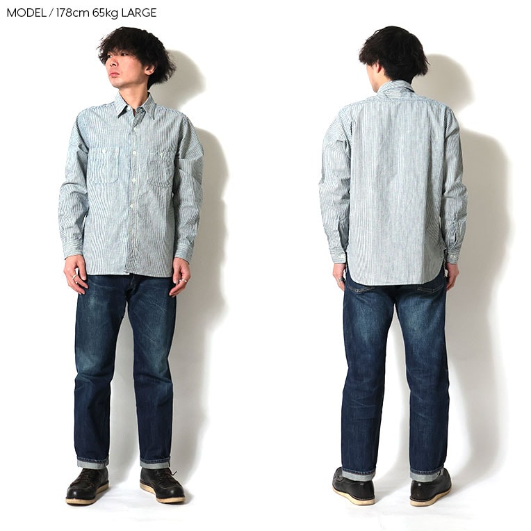 | 商品説明 | 国産のインディゴシャンブレー生地を使用したワークシャツ。柄違いでギンガムチェックとストライプも展開。ヴィンテージのストア系ブランドのインスパイアで、前立て裏やガゼットなどに特徴的なセルビッジ使いを多用している。製品ワンウォッシュ+天日干し加工入りで、生地に凹凸のある表情を再現。 |