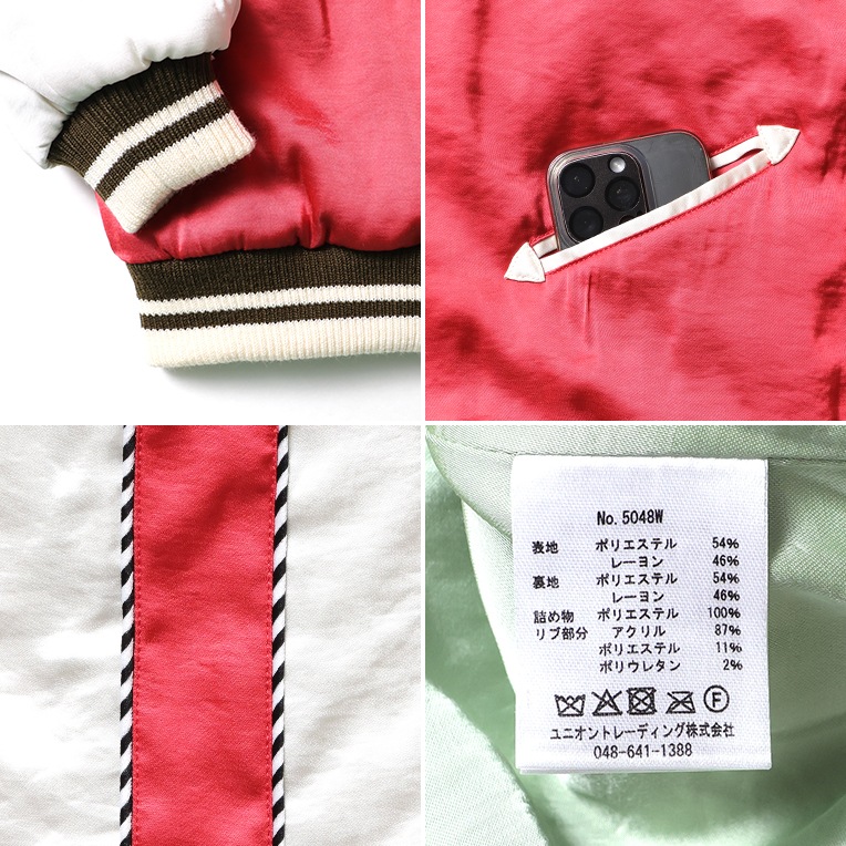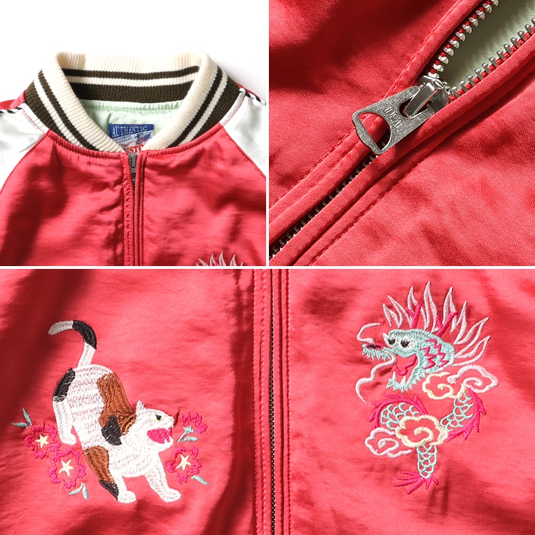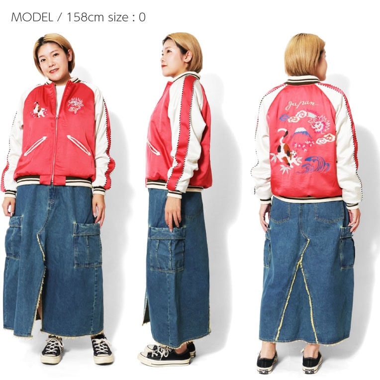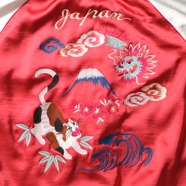 | 商品説明 | 人気のスカジャンをオリジナルの刺?で展開。和テイストを取り入れつつ、スカジャンの定番の龍と可愛らしい猫を組み合わせた柄をデザイン。程よくコンパクトなシルエットでスカートなどボリュームのあるボトムスとも合わせやすい女性が着やすいスカジャンです。 |