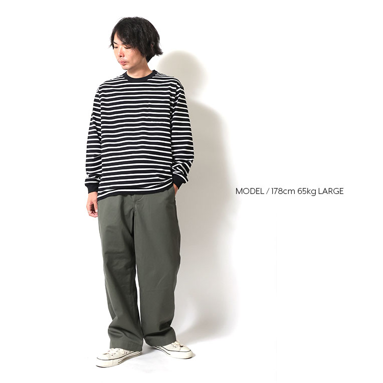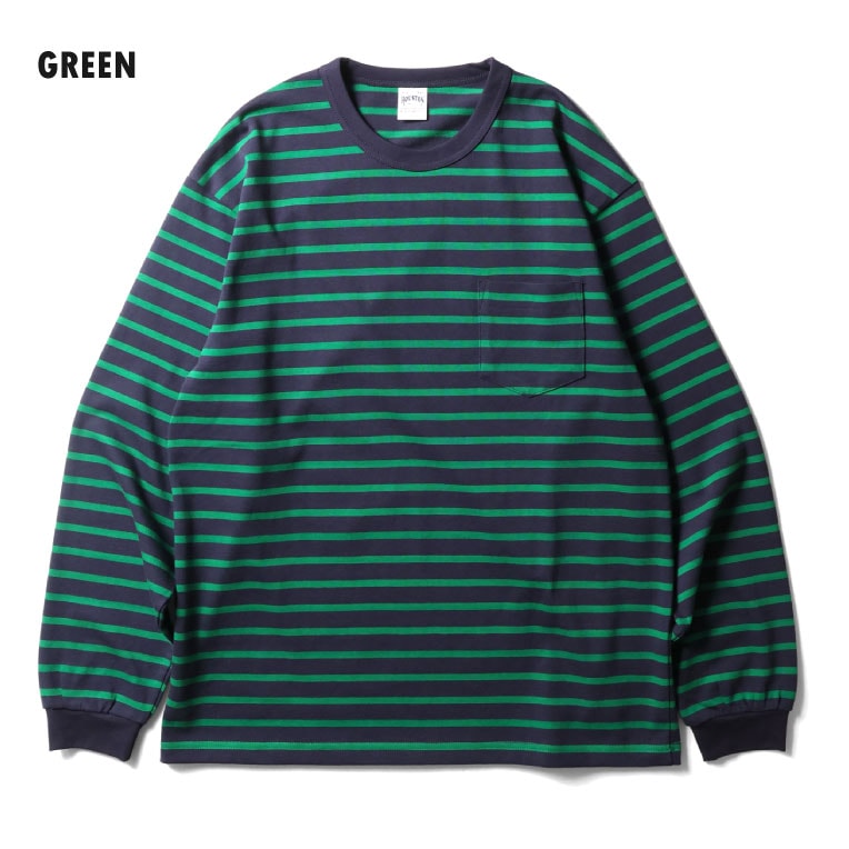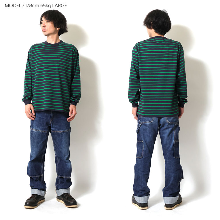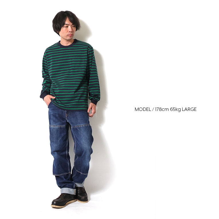 | 商品説明 | 8ozほどのヘビーボーダー天竺を使用した、クルーネックポケット長袖Tシャツ。先染めで組まれたボーダーは、定番カラーのブラックとネイビーに加え、どこか80~90年代を思わせるポップな配色も採用。あると何かと便利なポケット付き。 |