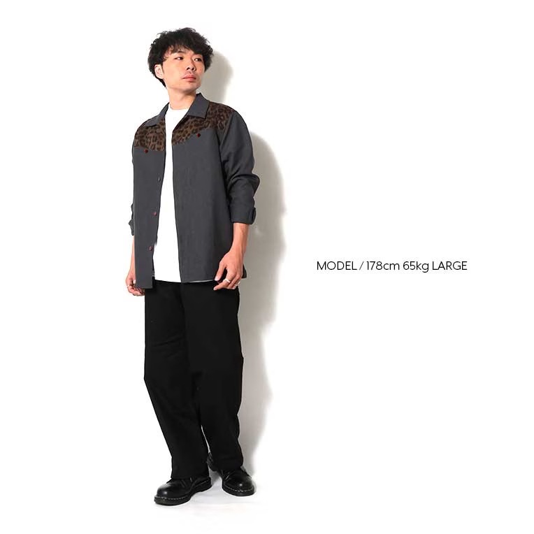 | 商品説明 | オープンカラー仕様のシャツジャケット。身頃上部にはヒョウ柄をデザイン。身頃部分の生地をやや厚めのピーチスキン生地を使用することで、春の軽アウターとしても着用可能に。身頃切り替え部分にはスラッシュポケットをデザインし、利便性の高い1着となっている。 |