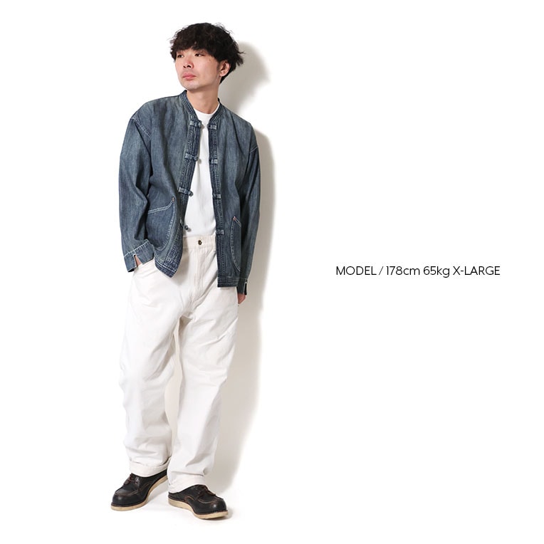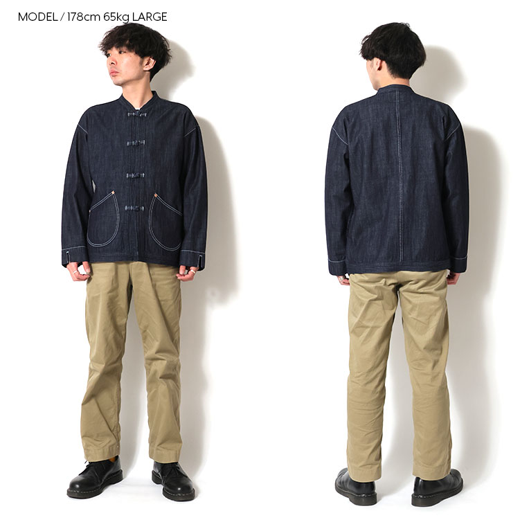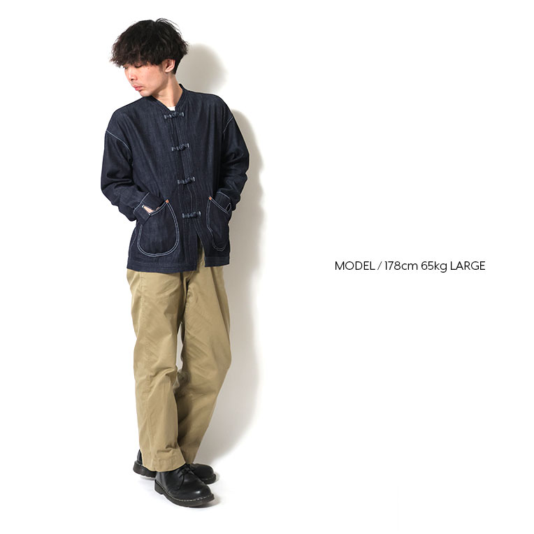 | 商品説明 | 8オンスのスラブデニムを使用した、共地のループとくるみボタンが特徴的なチャイナジャケット。 元々は中国からフランスへの移民労働者のために生産され、ワークウェアのディテールとチャイナ服のデザインの組合せが特徴的。 ユーロワーク系のビンテージ市場でも人気のアイテムで、パブロ=ピカソが好んで着用していたことでも有名。 |